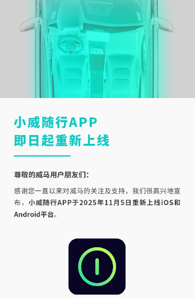 2025年11月,威马汽车在微博宣布:“好事将近,敬请期待。”随后官方APP“小威随行”上线,蓝牙车控、蓝牙钥匙、远程车控、车辆信息同步等功能恢复,但仅支持威马EX5、EX6车型。