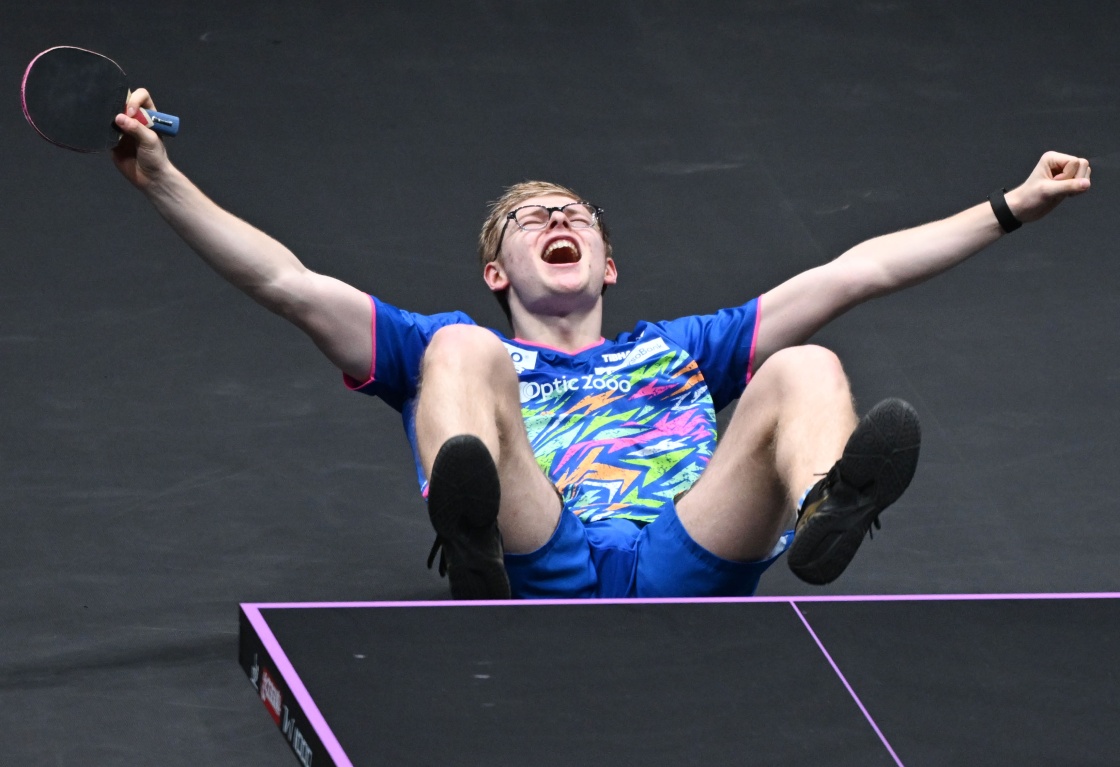 3月15日,法国选手费利克斯·勒布伦在比赛结束后庆祝胜利。新华社3月15日,中国选手温瑞博在比赛中发球。新华社3月15日,在重庆巴南区举行的世界乒乓球职业大联盟(WTT)重庆冠军赛男单决赛中,中国队选手温瑞博1-4不敌法国选手F·勒布伦,获得亚军。(人民日报客户端)