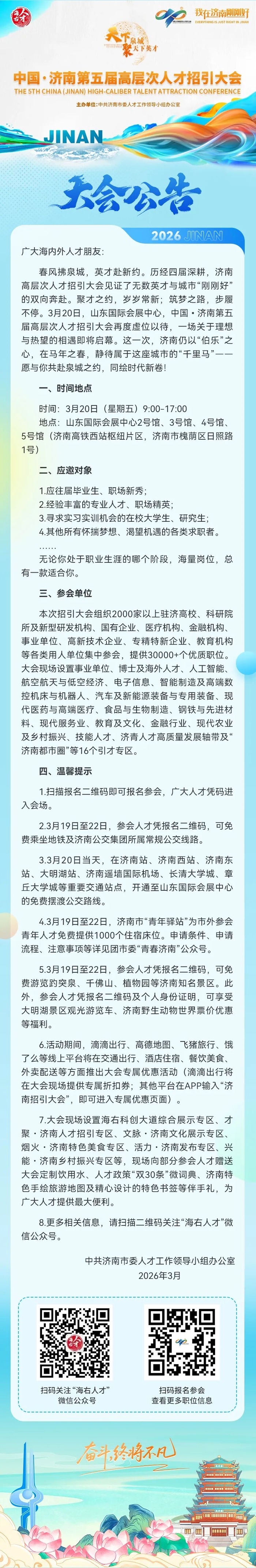 万事俱备,“职”等你来!即将开幕的第五届高层次人才招引大会,注定不只是一场汇聚海内外英才的求贤盛宴,更将是一次触摸济南发展脉动、沉浸式体验“刚刚好”城市魅力的双向奔赴之旅。