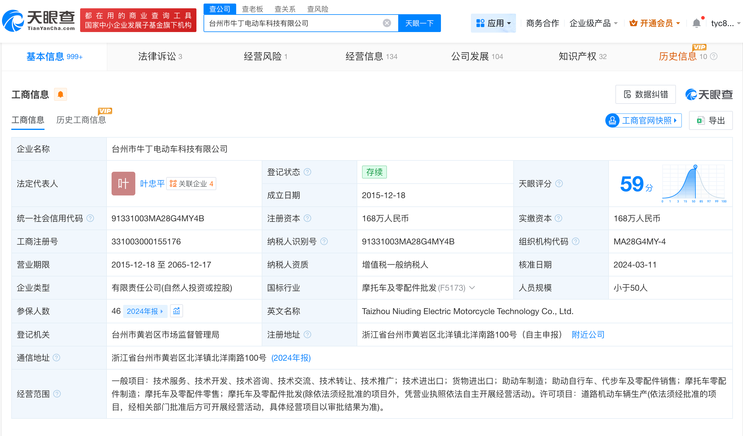 法律诉讼信息显示,该公司曾涉及财产损害赔偿纠纷、买卖合同纠纷。对外投资信息显示,去年6月,该公司成立了台州市牛丁进出口有限公司。分支机构信息显示,今年1月,该公司成立了台州市牛丁电动车科技有限公司头陀分公司。