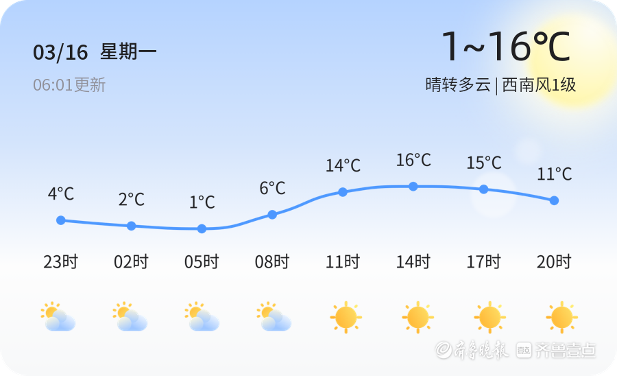 今天是2026年3月16日,星期一,农历正月廿八。淄博市今日天气晴转多云,气温范围在1℃至16℃之间,西南风1级,空气湿度为80%。当前空气质量良好(PM2.5为98微克/立方米),适合户外活动。但早晨气温较低,市民出行时需注意保暖,建议佩戴口罩以防止呼吸道疾病。今天的天气总体适宜出行,但早间温度较低,建议市民根据气温变化及时增减衣物。