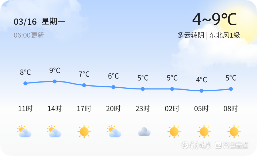 今天是3月16日,星期一,农历正月廿八。青岛市今天天气多云转阴,气温在4℃到9℃之间,东北风1级,空气湿度77%。空气质量状况为轻度污染(PM2.5指数为116),建议敏感人群减少外出,做好防护措施。市民出行时应根据天气变化适时增减衣物,注意保暖和防风。