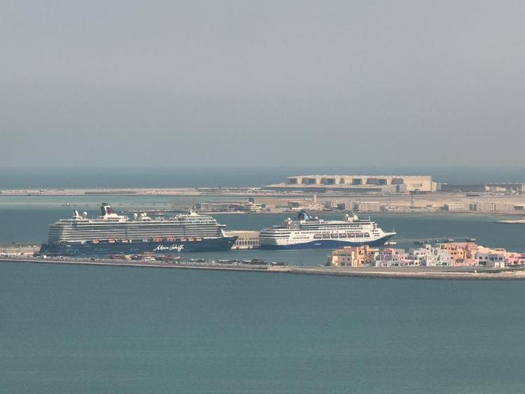 这是3月6日在卡塔尔首都多哈的港口拍摄的滞留的“迈希夫五号”邮轮(左)(手机照片)。新华社记者汪强摄