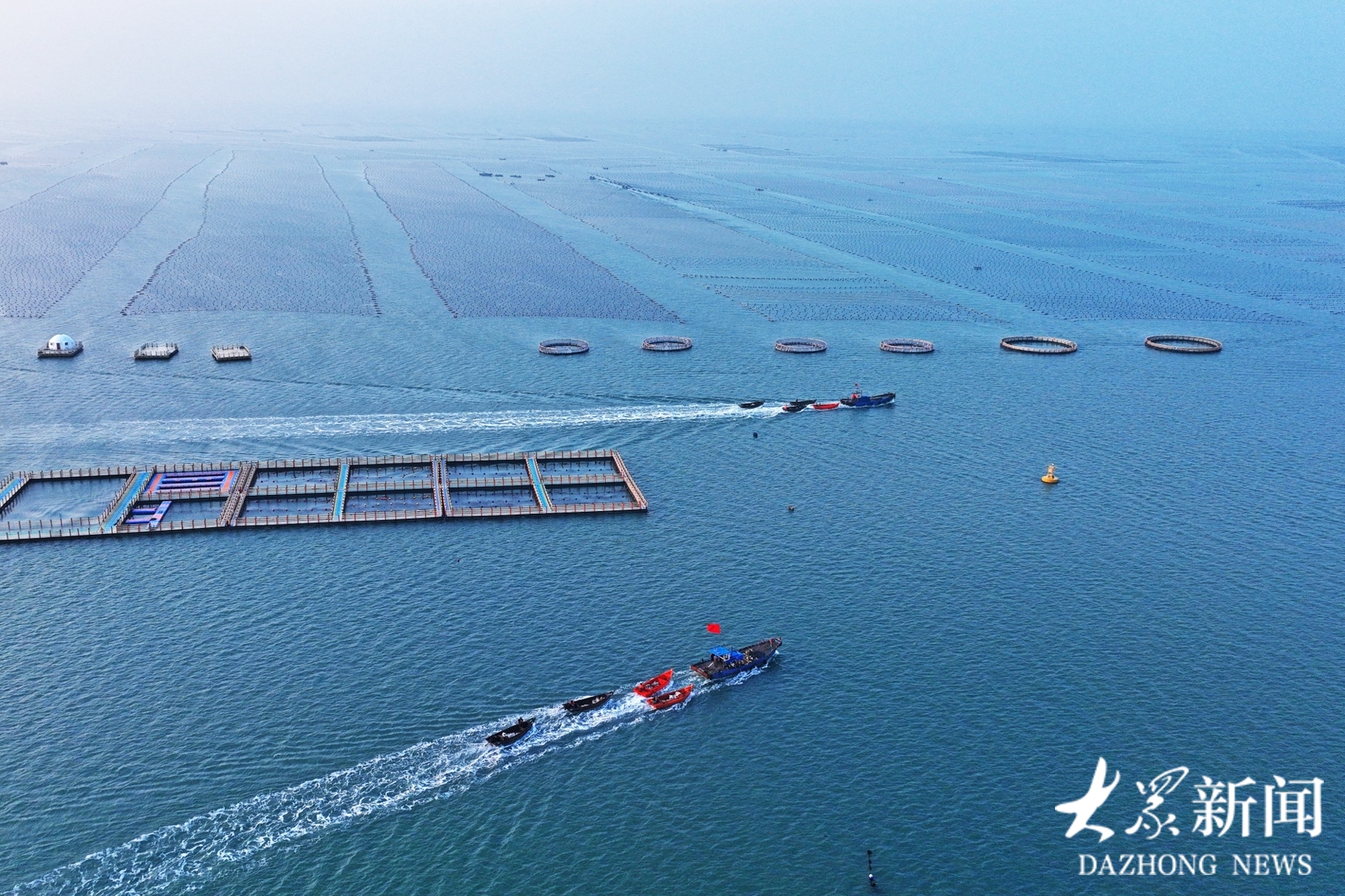 3月12日,荣成市爱伦湾海洋牧场海带养殖区,养殖工人驾驶养殖船穿梭其间,收获海带。当地春季收获的海带主要加工海带鲜菜,以翠绿、滑嫩、营养丰富等特点深受市场欢迎,前来订货的客户络绎不绝。(大众新闻通讯员张世松)