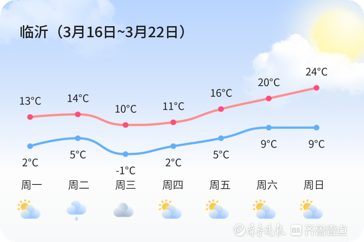 全市周平均最高温12℃,平均最低温3℃,平均气温8℃,周最高气温14℃,出现在周五、周六,周最低温1℃,出现在周一、周四。