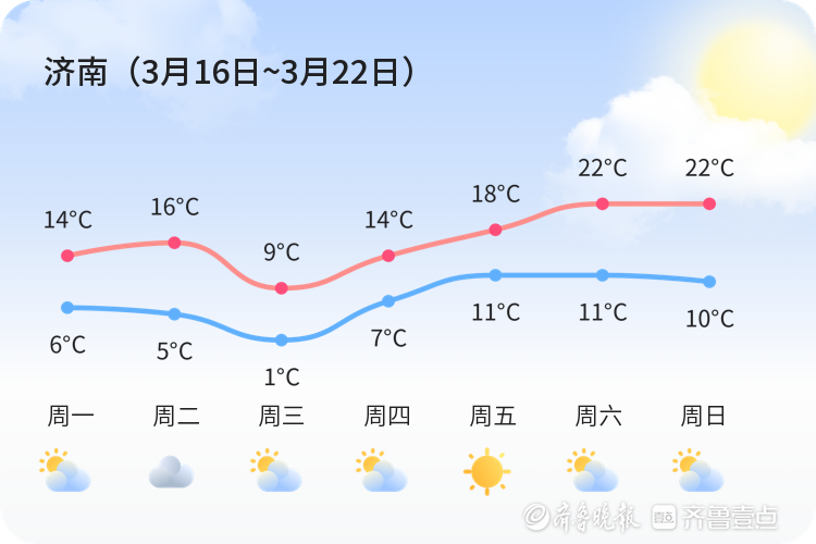 全市周平均最高温12℃,平均最低温3℃,平均气温8℃,周最高气温15℃,出现在周五,周最低温1℃,出现在周六。