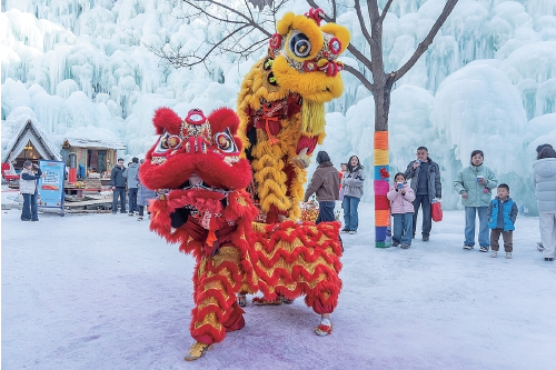 九如山的冰上舞狮成为打卡亮点。