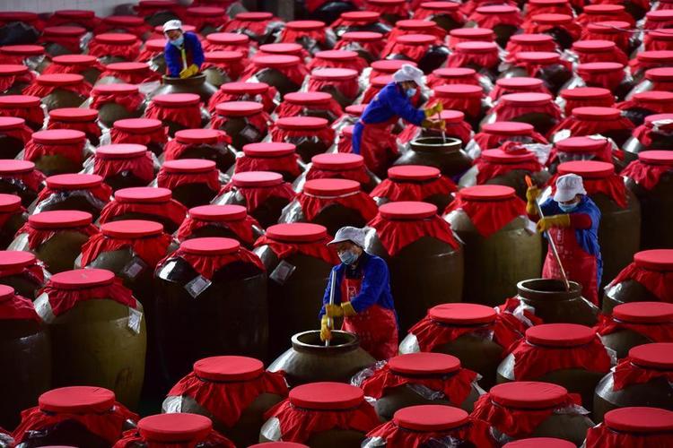 Workers stir sour soup, a local traditional food made from fresh chilies, tomatoes and gingers, in fermentation at a food processing plant in Majiang county of Qiandongnan Miao and Dong Autonomous Prefecture, southwest China's Guizhou Province, Dec. 3, 2020.