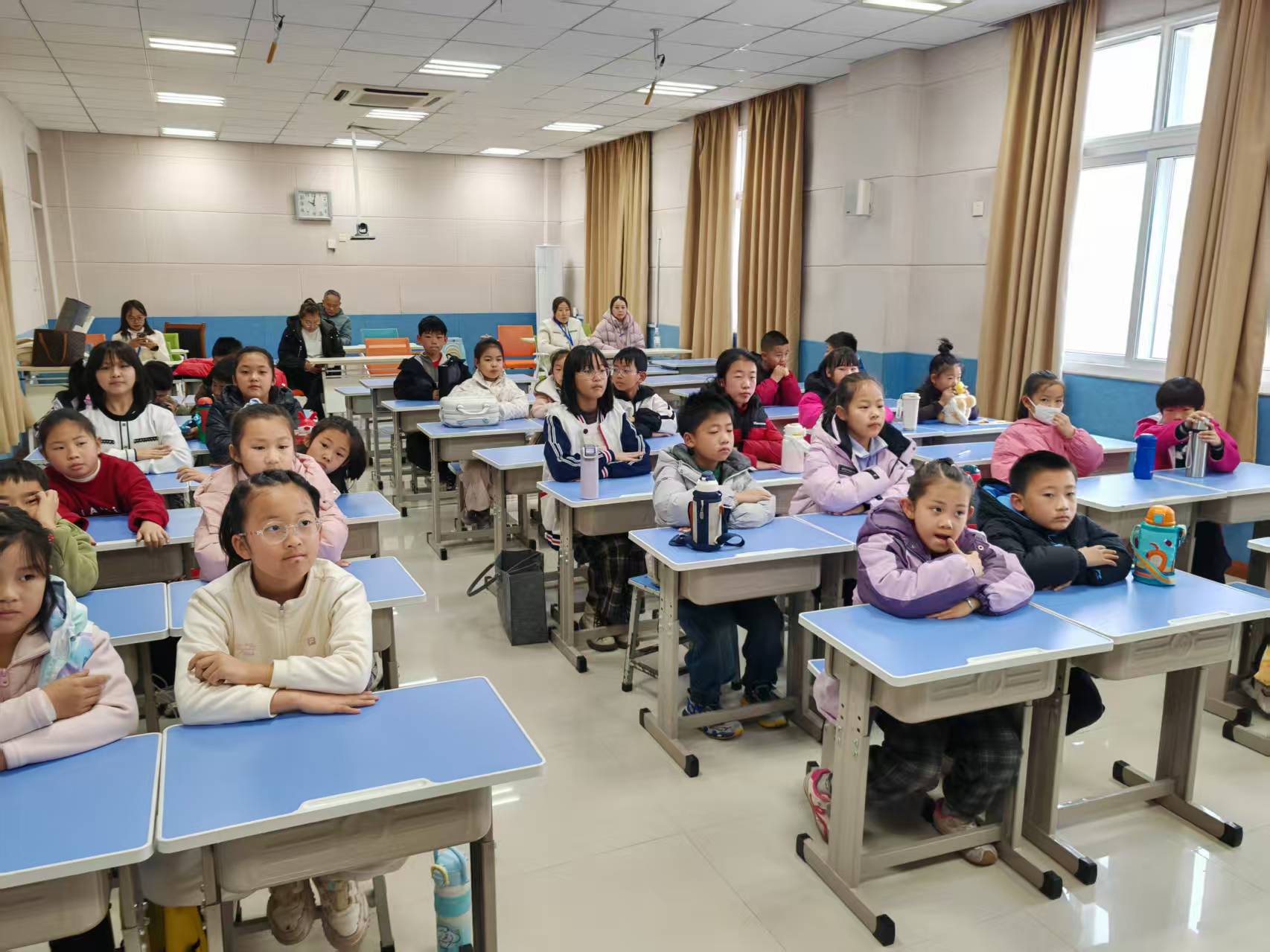 校园里到处都是生机勃勃的样子,真美呀!我们的教室明亮又干净,窗户擦得透亮。阳光透过窗户洒进来,落在蓝色的课桌上,也落在我们的小脸上,暖洋洋的。老师站在讲台上,带着我们练习口部操。“张大嘴巴AAA,圆圆嘴巴OOO……”老师的声音甜甜的,我们都坐得笔直,眼睛紧盯着大屏幕,跟着老师认真做动作。我一边跟随老师练习,一边偷偷瞧了瞧坐在教室后面的爸爸妈妈,他们正笑眯眯地看着我,还向我竖大拇指呢!我立刻做得更认真了,想让爸爸妈妈看到我最棒的样子。
