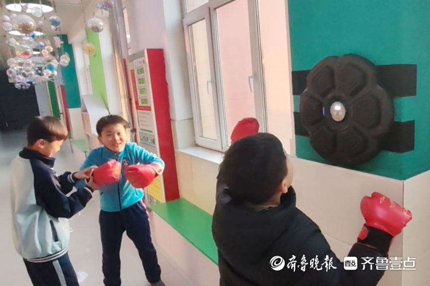 淄博市张店区凯瑞小学走廊里的拳击靶,是孩子们课间释放压力的地方。