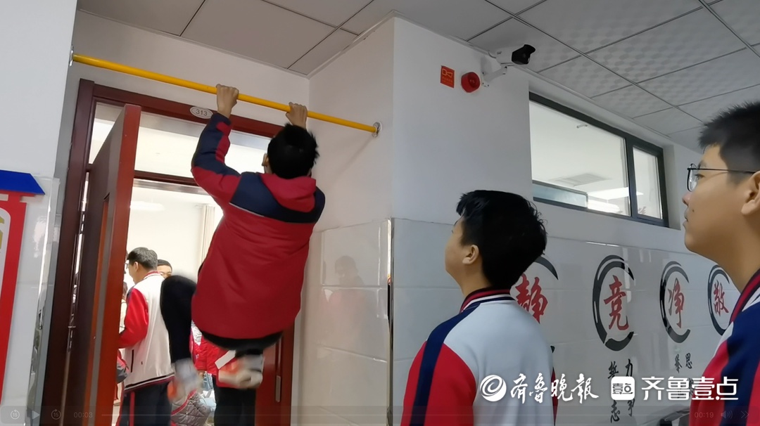 桓台一中附属学校的初中部,给出了不一样的答案。下课铃响,初四级部的学生,没有趴在桌上补觉、刷题,而是自然走到走廊,躺在垫子上做仰卧起坐,或是在班级门口的单杠前排队拉引体向上。