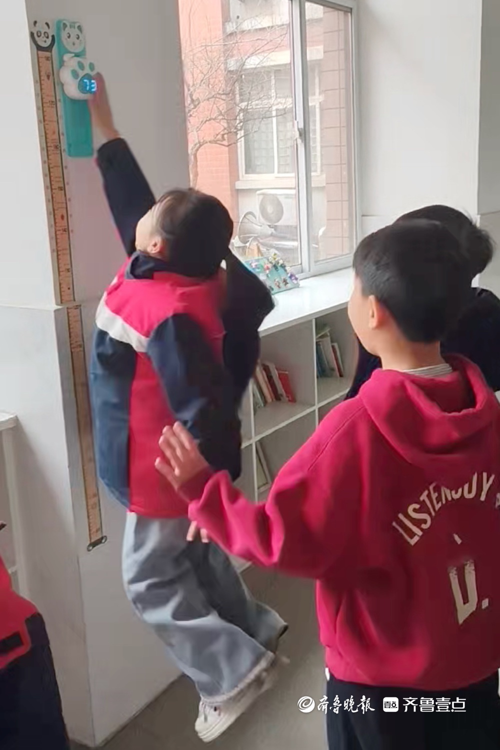 摸高器前,小学生们正较着劲儿起跳,你摸一米八,我冲一米九。
