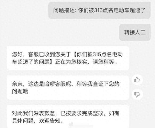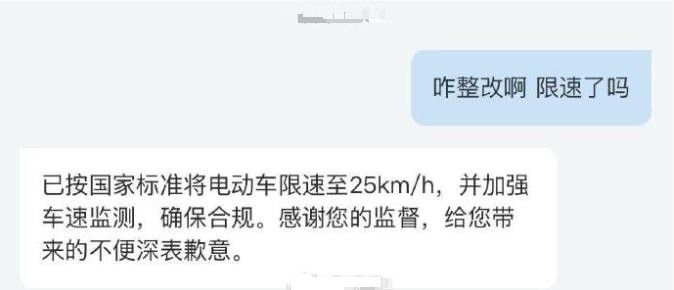 哈啰客服回复称:已关注到3.15晚会的相关报管理层高度重视,已在第一时间成立专项应急工作组,连夜开展全面自查与整改。“对此我们深表歉意,已按要求完成整改。已按国家标准将电动车限速至25km/h,并加强车速监测,确保合规。”