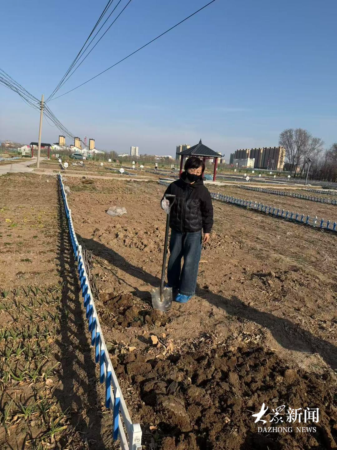一位女士正手持铁锨挖脚下的土,她戴着防晒口罩,脚套防尘鞋套,一身休闲外套干净新潮,看打扮不像附近农民,询问得知,她是附近城区居民,刚刚退休。“没想好种什么,先把下面的土翻出来晒晒。”她介绍,自己从去年开始租种这块田。“种过葱、辣椒、茄子,还有白萝卜、小白菜,很好玩。”她擦了擦额角的汗,眼里满是笑意。