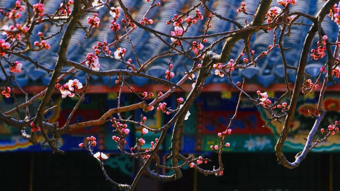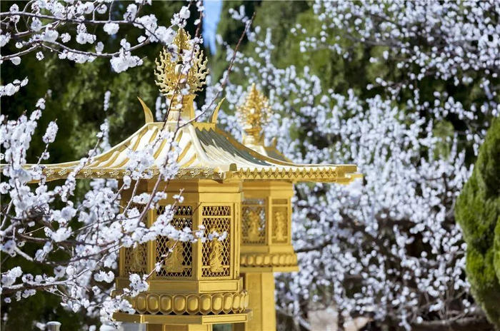 粉白的杏花点缀在圣境的亭台楼阁间,将人文景观与自然美景完美融合,是赏杏、感受传统文化的绝佳之地。