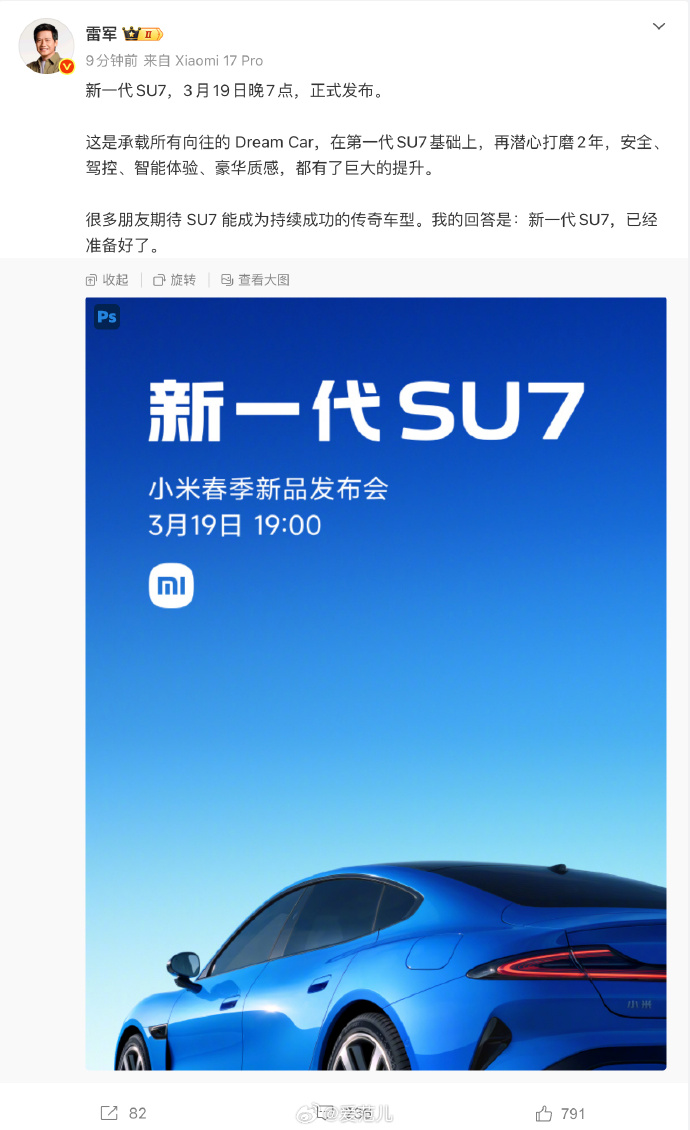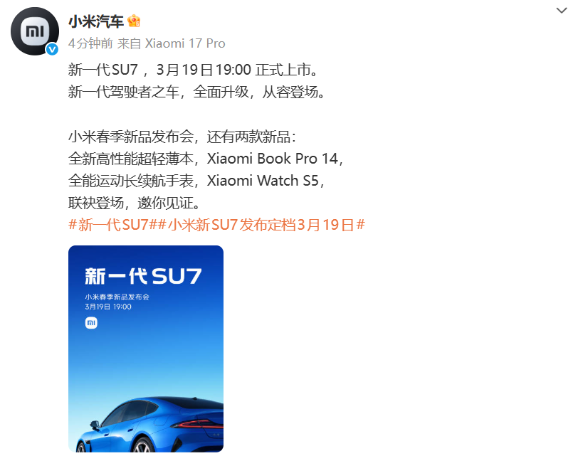 同日,@小米汽车 发文官宣新一代SU7,3月19日19:00 正式上市。