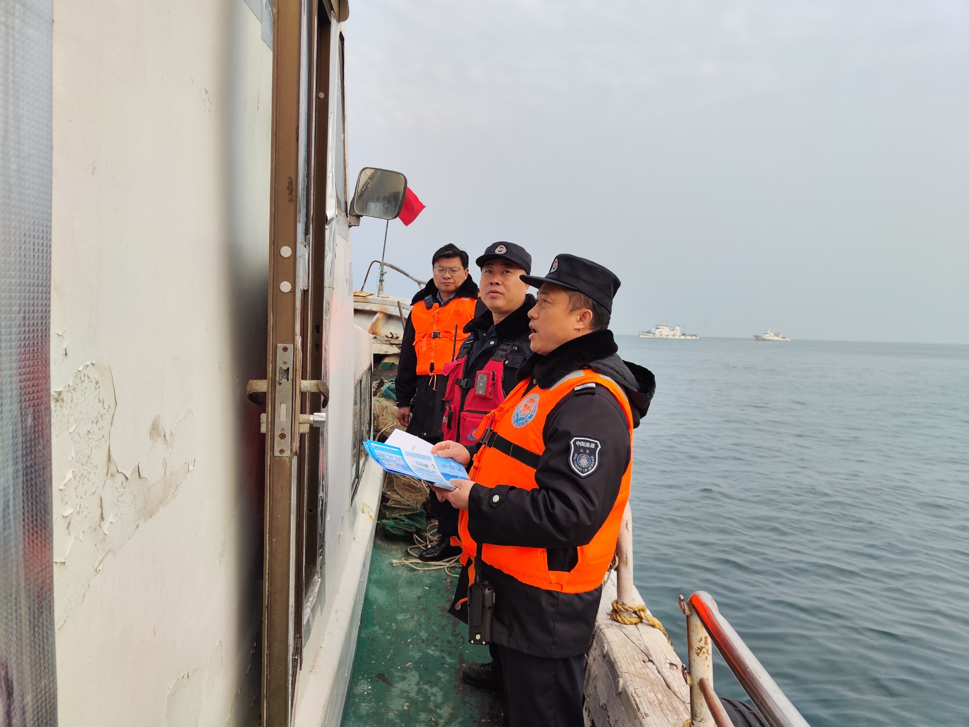 此次首航行动中,执法组始终践行“主动靠前、服务暖心、监管严格”的工作理念,聚焦渔船集中作业渔区,采取“海上巡护+登船检查+现场普法”的执法模式,既亮出执法“实招”,又传递服务“温度”。行动期间,执法人员主动下沉一线倾听养殖户诉求,及时处置化解海上生产堵点难点问题;登船开展新《渔业法》及渔业安全生产知识宣讲,指导渔民规范作业流程、排查安全隐患,协助做好渔船安全防护等服务工作,推动法治宣传走进船舱、安全常识深入人心,切实提升渔民依法作业、安全生产的自觉性。