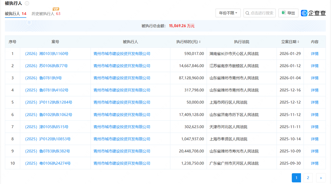 日前,据企查查提供的信息显示,青州市城市建设投资开发有限公司(以下简称“青州城投”)多次成为被执行人,且被法院限制高消费。该公司现存14条被执行人信息,被执行总金额约1.51亿元;公司及其法定代表人、董事长、总经理张奥琪15次被法院限制高消费,涉案总金额279.90 万元。