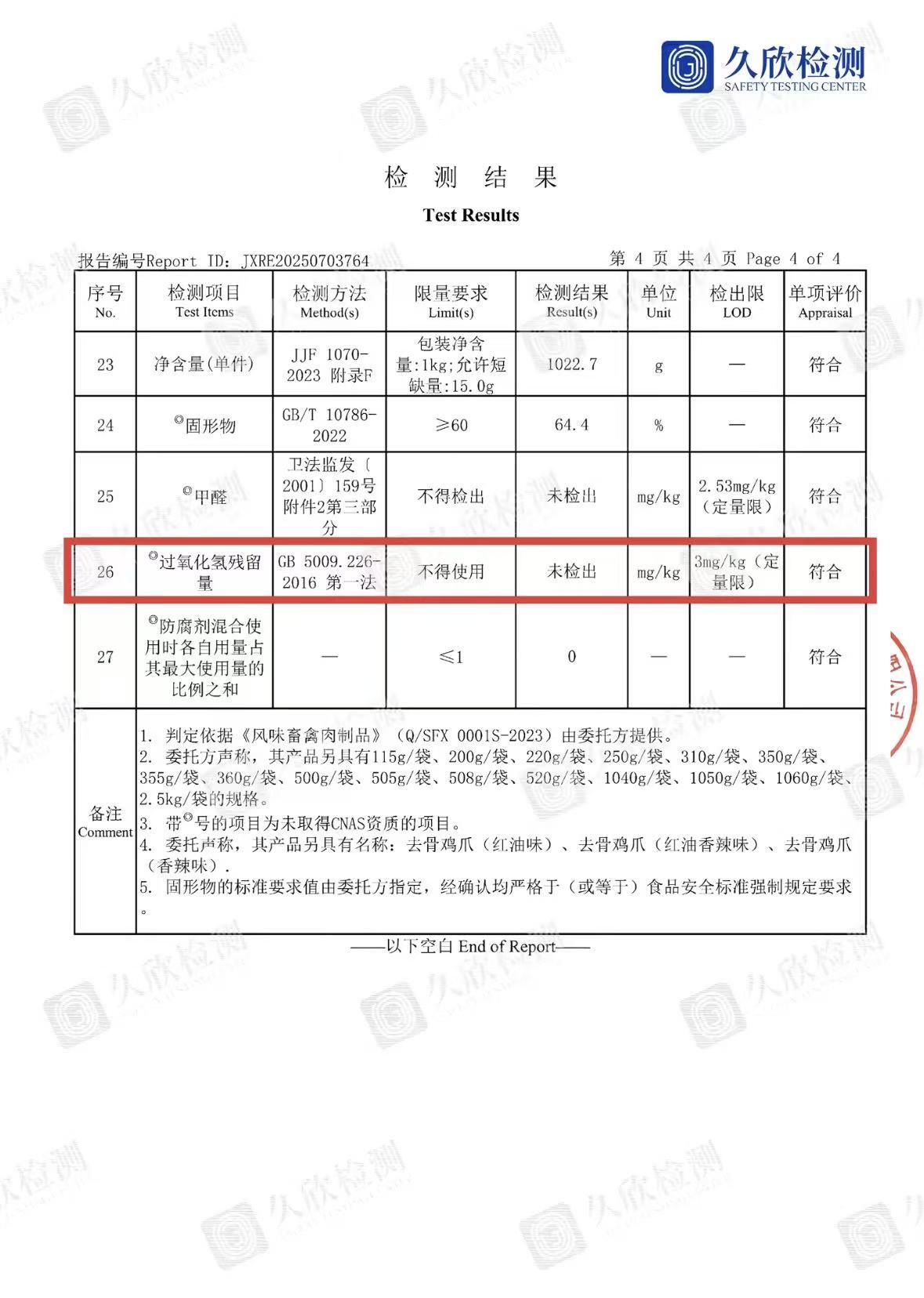 同时,商家披露,自2025年2月《食品安全国家标准 食品添加剂使用标准》执行以来,已对上述产品开展2次连续抽检,检测报告均显示“过氧化氢残留量(双氧水)未检出”,结果合格。