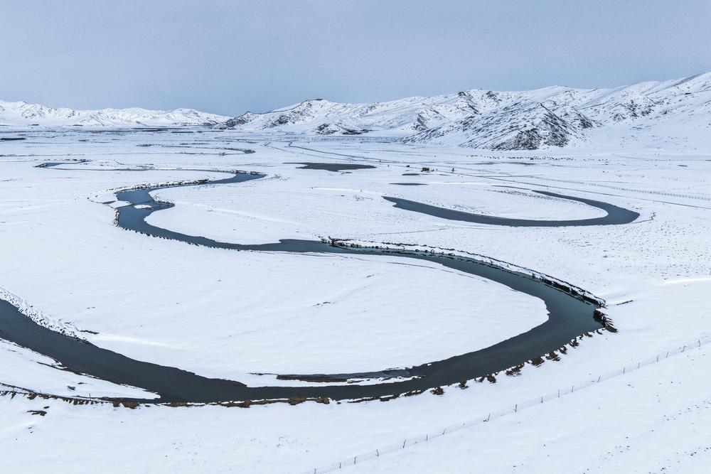 14일 드론으로 내려다본 아바현 초원 설경. 2026.3.14