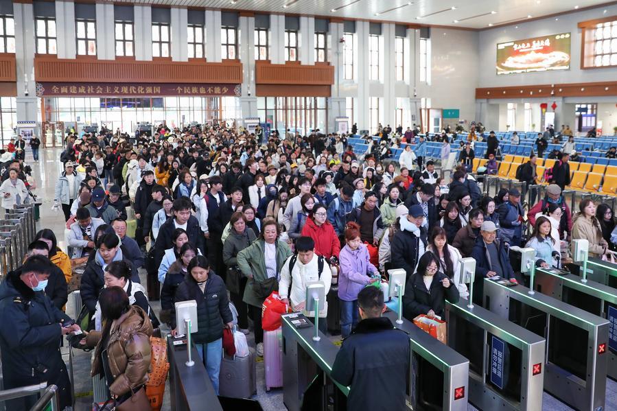13일 윈난(雲南)성 샹거리라(香格里拉)역에서 개찰구를 통과 중인 여객들. (사진/신화통신)
