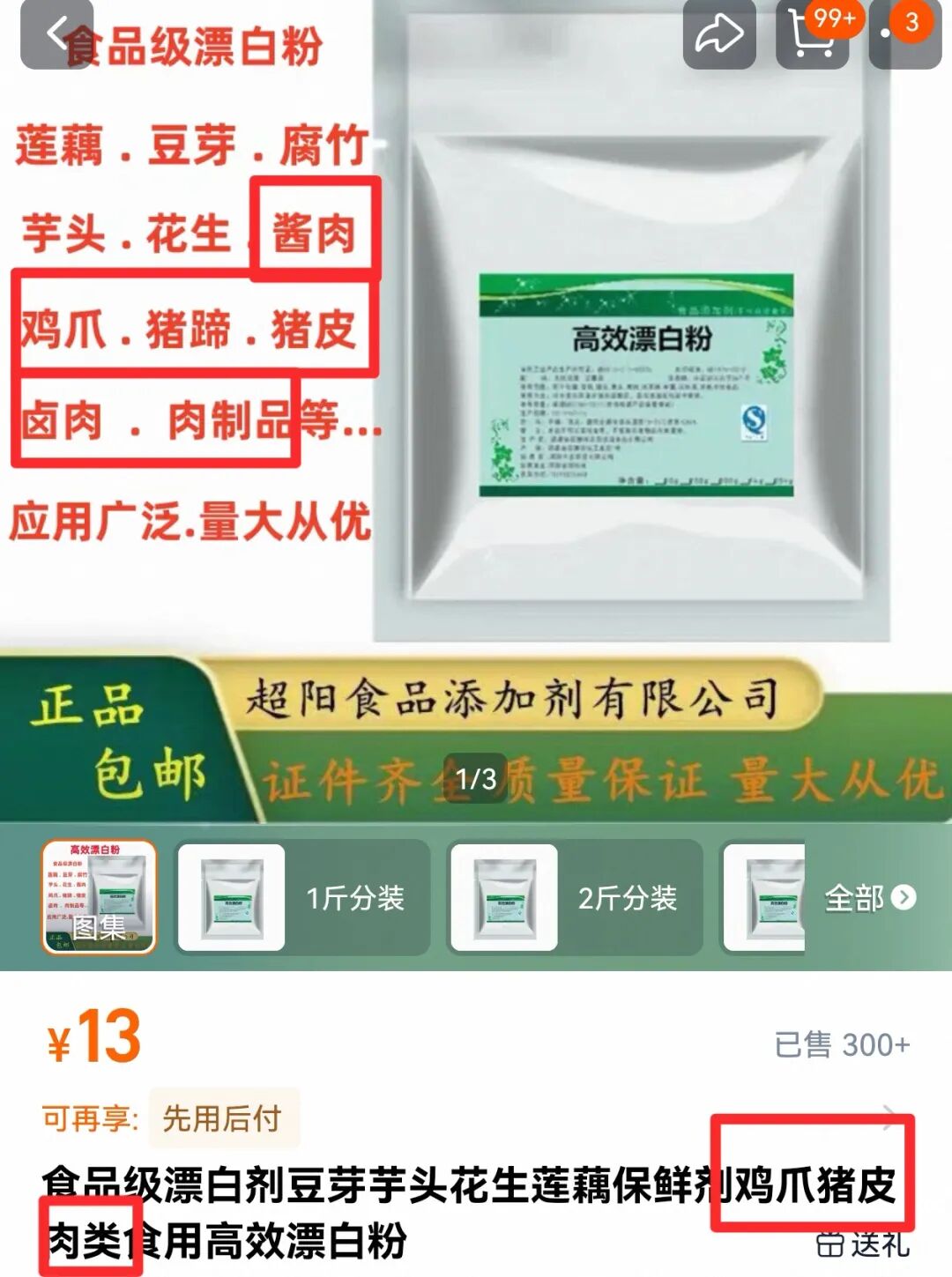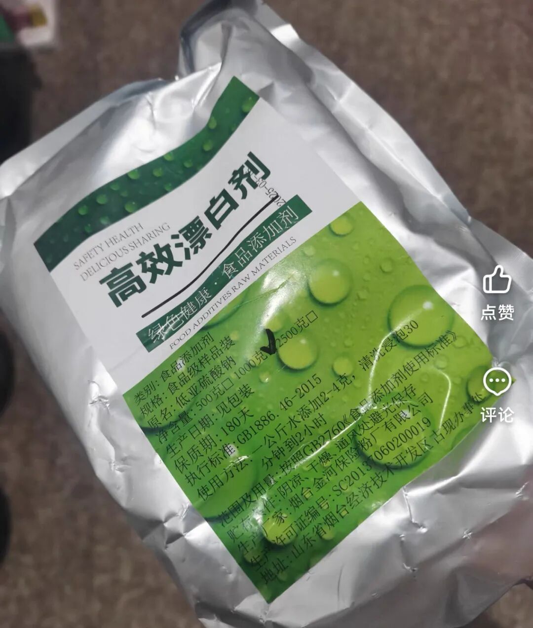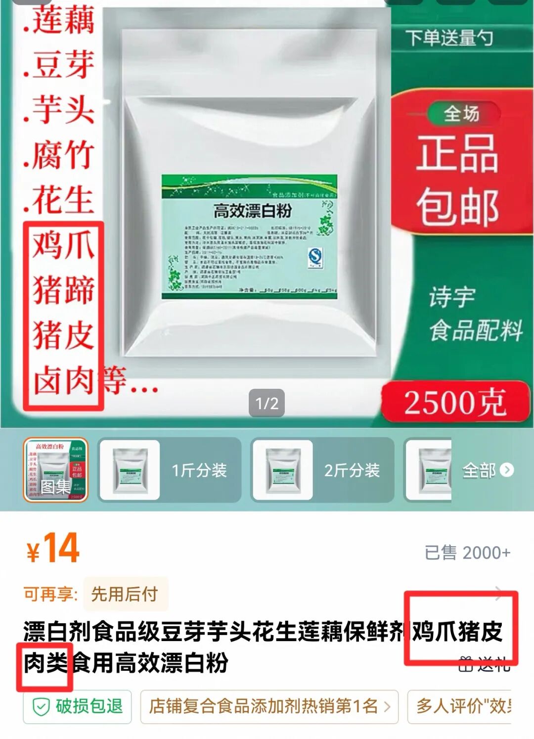 漂白鸡爪被曝光后,购物App中仍有多个商家卖“食品级漂白粉”