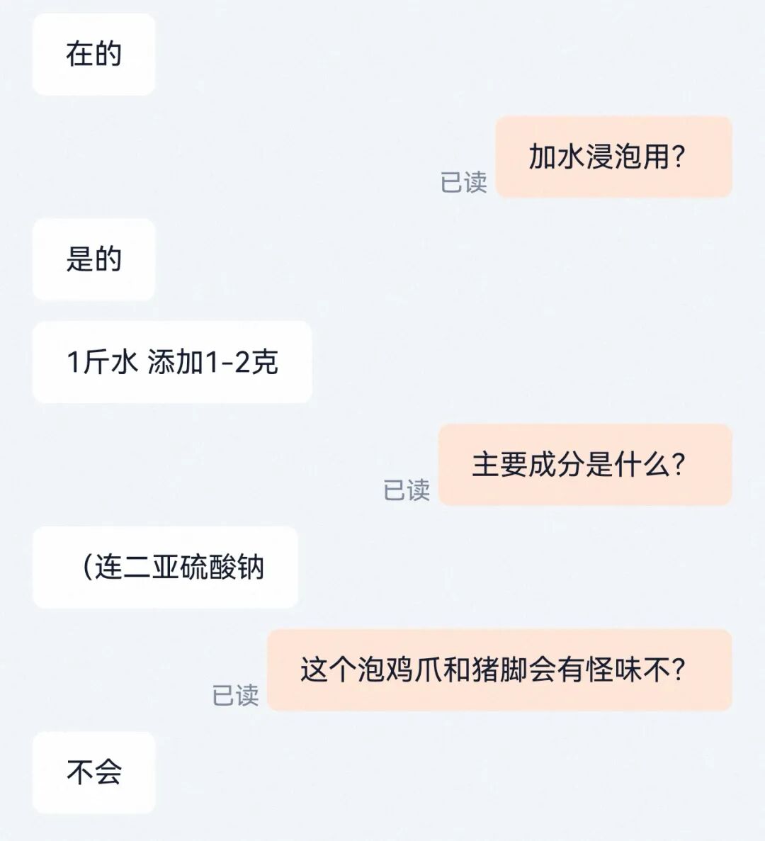 记者点进一家包装袋上未标注成分的网店,询问商家所售食用级漂白粉成分,被告知也为连二亚硫酸钠,这位商家还告诉记者,用其产品漂白鸡爪、猪脚后不会有怪味。