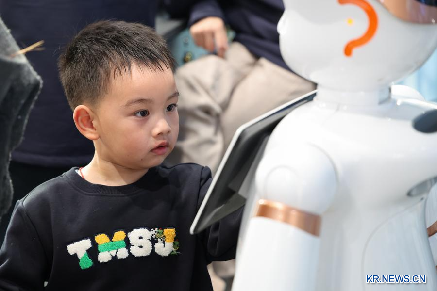 지난 1월 16일 광둥(廣東)성 선전(深圳)시 룽강(龍崗)구에 있는 세계 최초의 로봇 6S(판매·부품·서비스·조사·맞춤 판매·공동구매) 매장에서 한 어린이가 로봇과 상호작용하고 있다. (사진/신화통신)