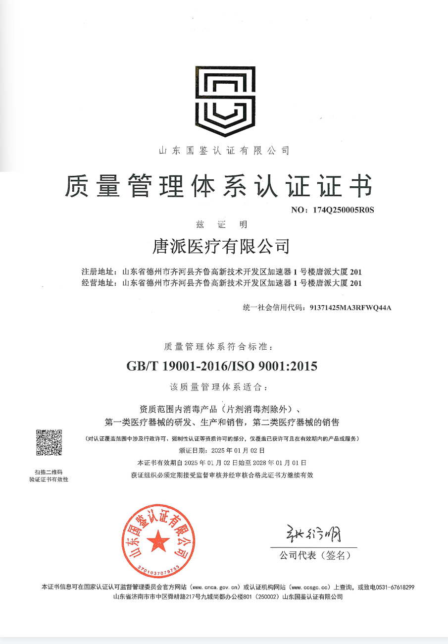 在研发端,唐派医疗组建了一支高素质、高水准的研发团队,由北京大学、清华大学、山东大学等名校博士及博士后领衔。强大的智力支持带来了丰硕的科研成果,截至目前,企业已成功申请专利19项、软件著作权7项,构建了核心的技术壁垒。同时,企业不断完备资质认证,持有Ⅰ类、Ⅱ类医疗器械备案资质90余项,并通过了ISO9001质量管理、ISO14001环境管理及ISO13485医疗器械质量管理体系认证,形成了全方位质量保障网络。正是这些硬实力,使其在消毒产品等领域实现了“杀菌率99.999%”的突破性成果,赢得了市场的广泛信任。