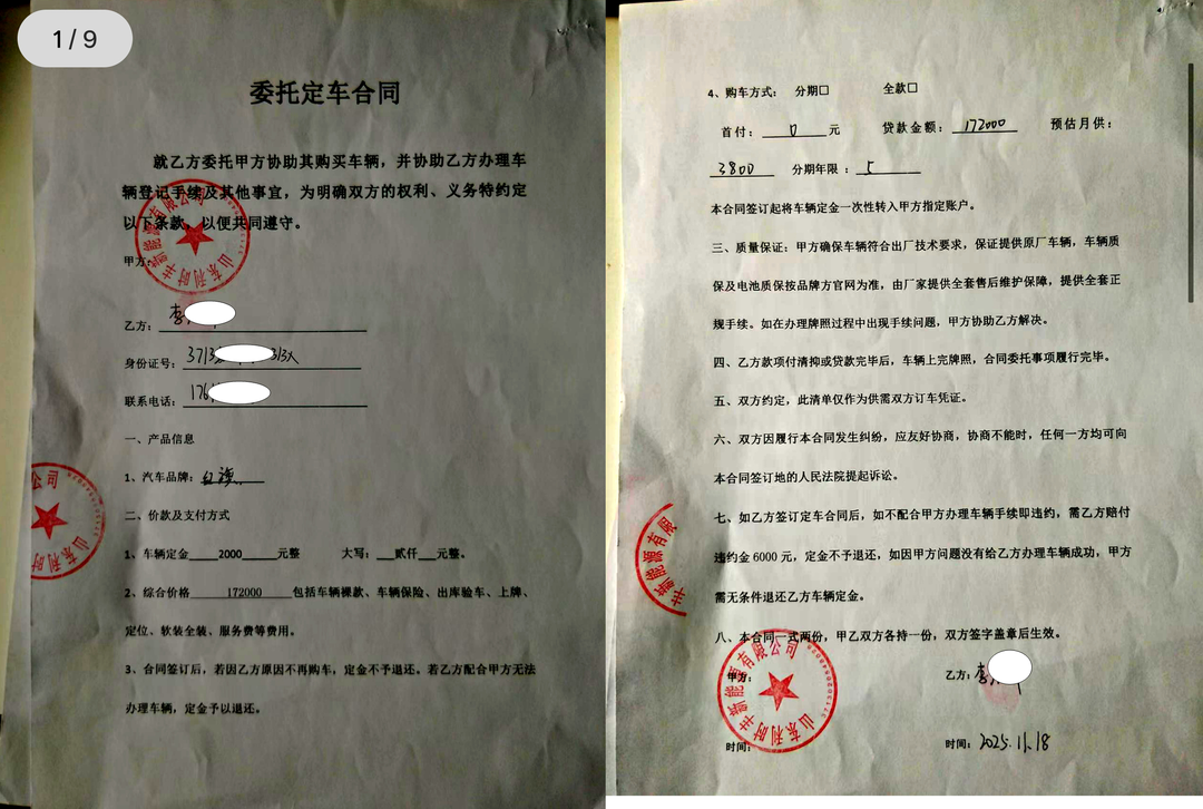 由于12.6万元的车价与17.2万元的定车综合价格相差4.6万元,李先生说,当时,山东利时丰新能源有限公司工作人员让他使用网贷支付剩余款项,“我没有同意使用网贷,就说不干了,但是公司让赔违约金,还扣下了身份证。”