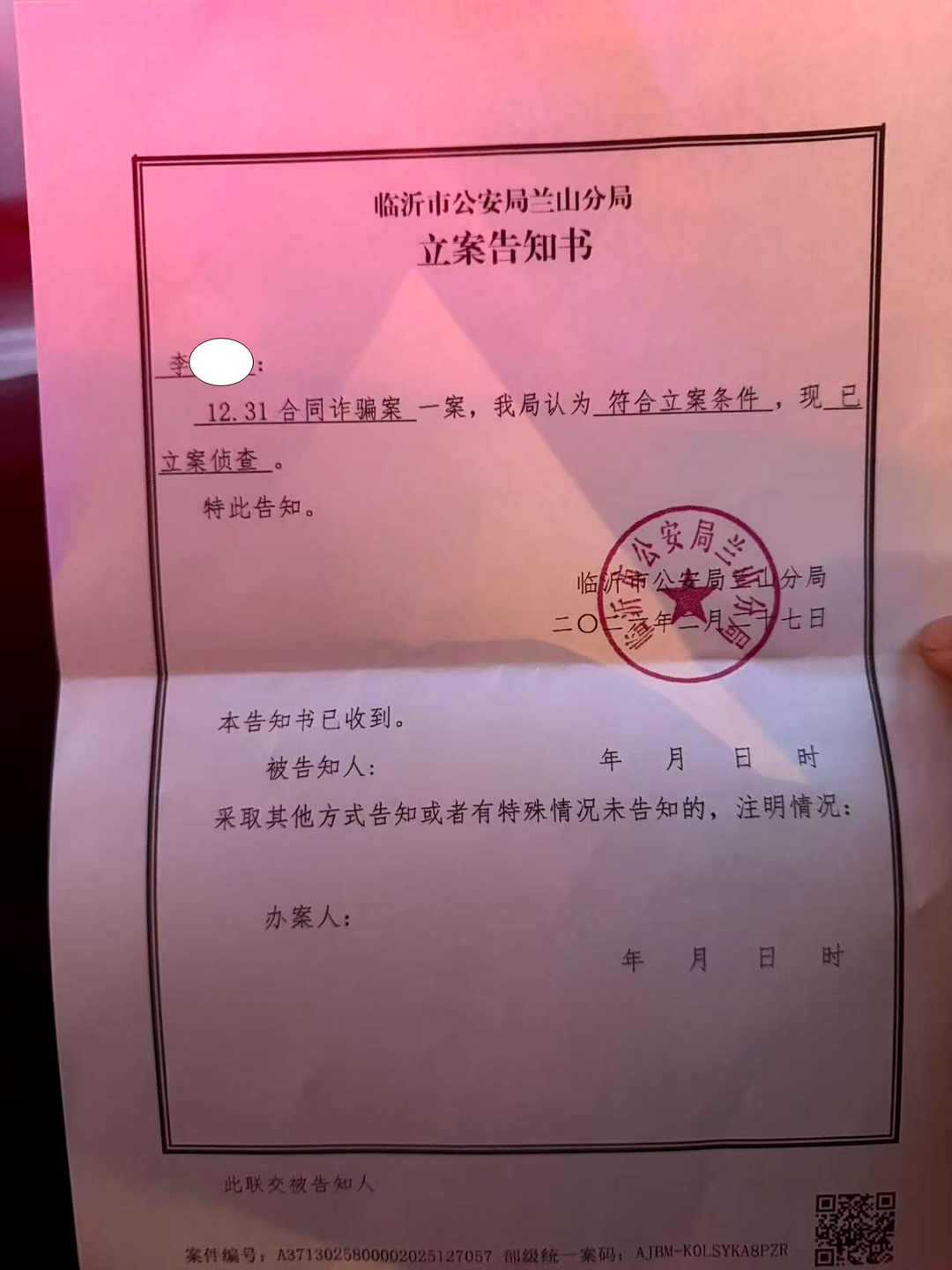 2月27日,临沂市公安局兰山分局以合同诈骗为由立案。