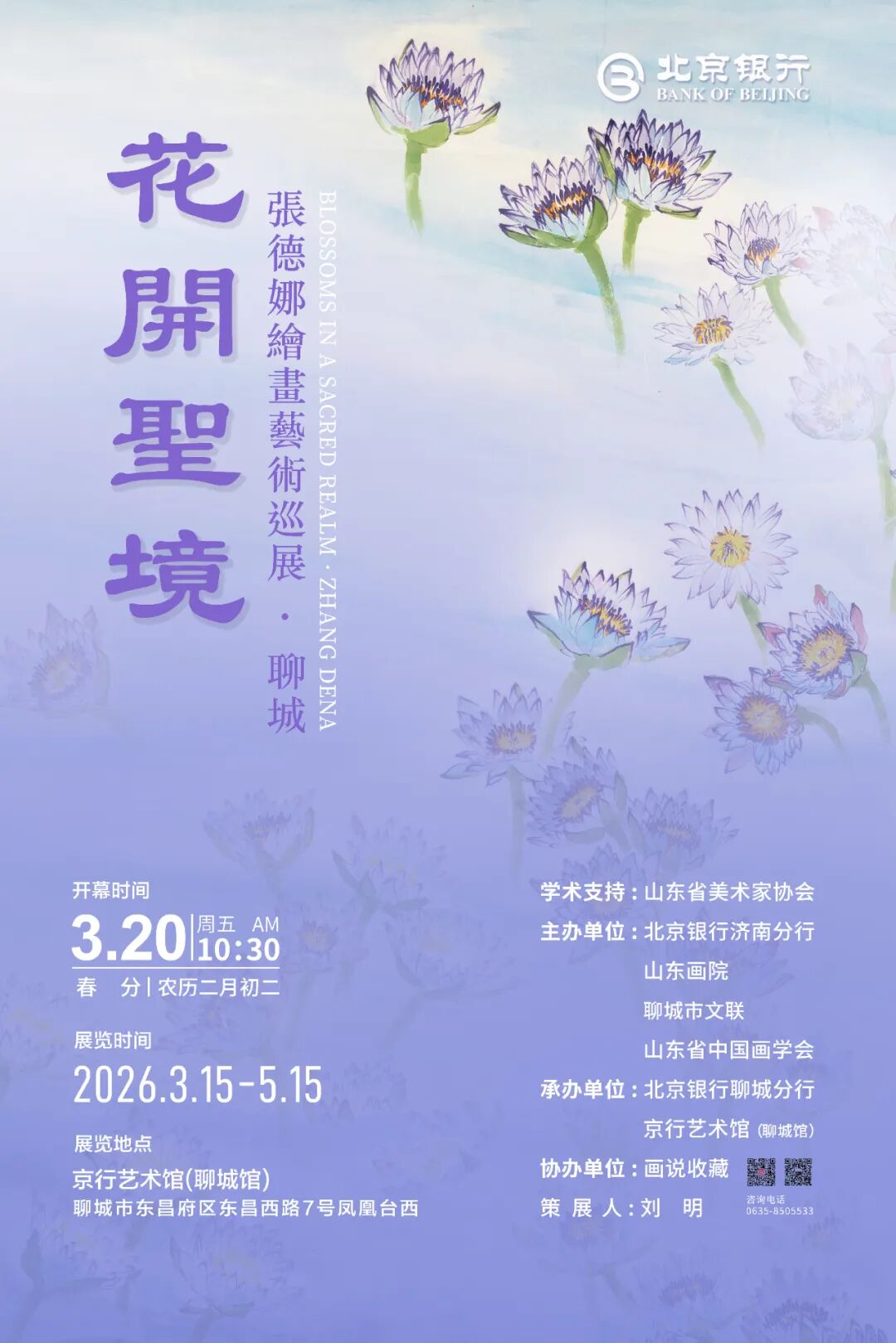 “花开圣境——张德娜绘画艺术展”于3月15日至5月15日,在北京银行聊城市京行艺术馆展出。本次展览由北京银行济南分行、山东画院、聊城市文联、山东省中国画学会主办,北京银行聊城分行、京行艺术馆聊城馆承办,山东省美术家协会学术支持,画说收藏协办。展览以“花开圣境”为主题,以浪漫主义和现实主义结合的情怀,以新时代花鸟画创作的新理念和技法,营造了明亮、祥和、深远的艺术氛围,弘扬了天人合一、生生不息的中华优秀传统文化,讴歌了“绿水青山就是金山银山”的新时代发展理念,让运河之畔的水城聊城,浸润在丹青雅韵之中。