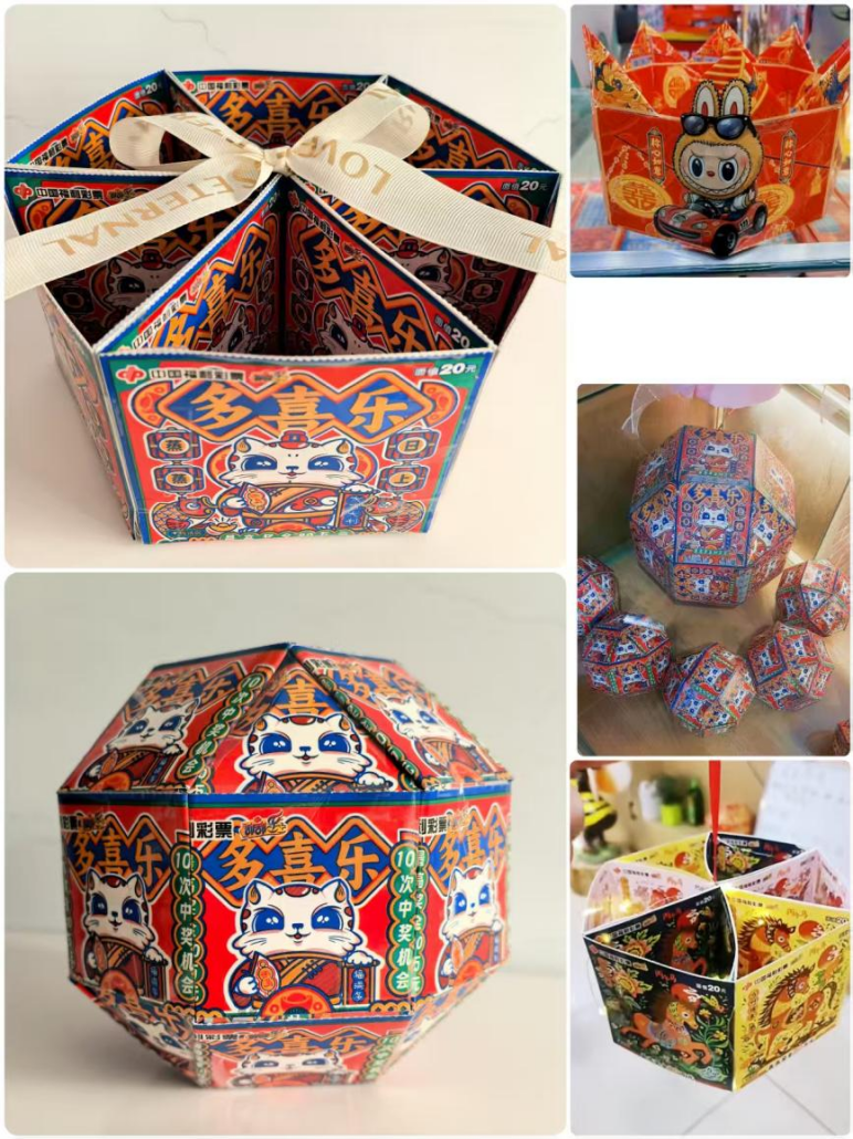 而当鲜花凋零,这份春意又该如何延续?在山东日照,一位站点的代销者则让幸运以另一种形式延续。她发现那些印制精美的刮刮乐,刮开后常被随手丢弃,于是萌生了“变废为宝”的想法。通过巧手折叠、拼接,一张张彩票化身为色彩绚丽的小灯笼、储物盒,甚至定制成永不凋零的刮刮乐花束。有顾客手捧一束由“喜相逢”彩票制成的红色花束,惊喜地说:“这是最特别的纪念品,感觉那份快乐被延长了。”