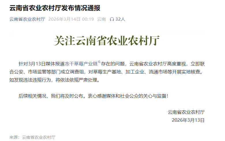 3月14日,云南省农业农村厅发布通报称,针对3月13日媒体报道冻干草莓产业链存在的问题,云南省农业农村厅高度重视,立即联合公安、市场监管等部门成立调查组,对草莓生产基地、加工企业、流通市场等开展实地核查。如发现违法违规行为,将依法依规严肃处理。