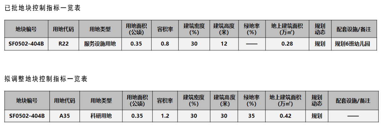 SF0502-404B地块用地面积0.35公顷,用地性质由服务设施用地调整为科研用地,容积率由0.8调整为1.2,建筑高度由12米调整为30米,地上建面由0.28万㎡调整为0.42万㎡。