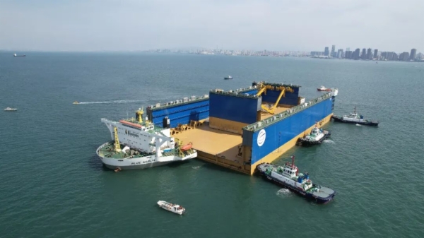 由于航道通航交通密度大,为更好地控制浮船坞,保证其安全,1艘拖轮采用吊拖方式进行主拖,另外3艘拖轮在平台两舷及尾部辅助配合,确保拖航过程平稳安全可控。在此期间,“青港拖6”轮、“寰宇六号”轮提前航行至青岛港内锚地,协助半潜船“蓝色马林”轮稳固船位。10时,浮船坞拖带编队到达浮装作业内锚地,准备浮装作业。6艘拖轮紧密配合,通过持续调整船位与缆绳受力,对航向、船距进行毫米级精细操控,整个过程平稳有序。13时30分,浮船坞浮装到位,6艘拖轮历经7小时,圆满完成此次高难度作业任务。
