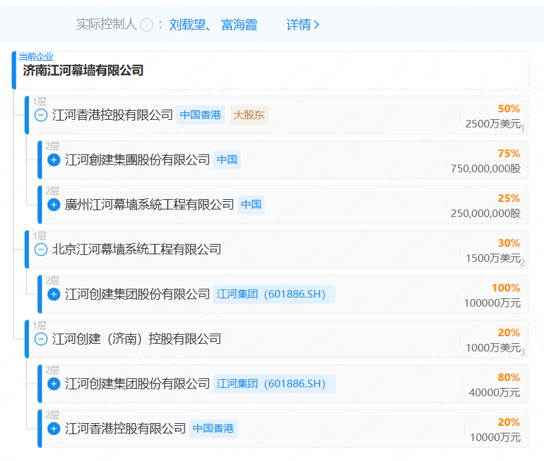 股权结构方面,江河香港控股有限公司持股50%,为公司第一大股东;北京江河幕墙系统工程有限公司持股30%;江河创建(济南)控股有限公司持股20%。