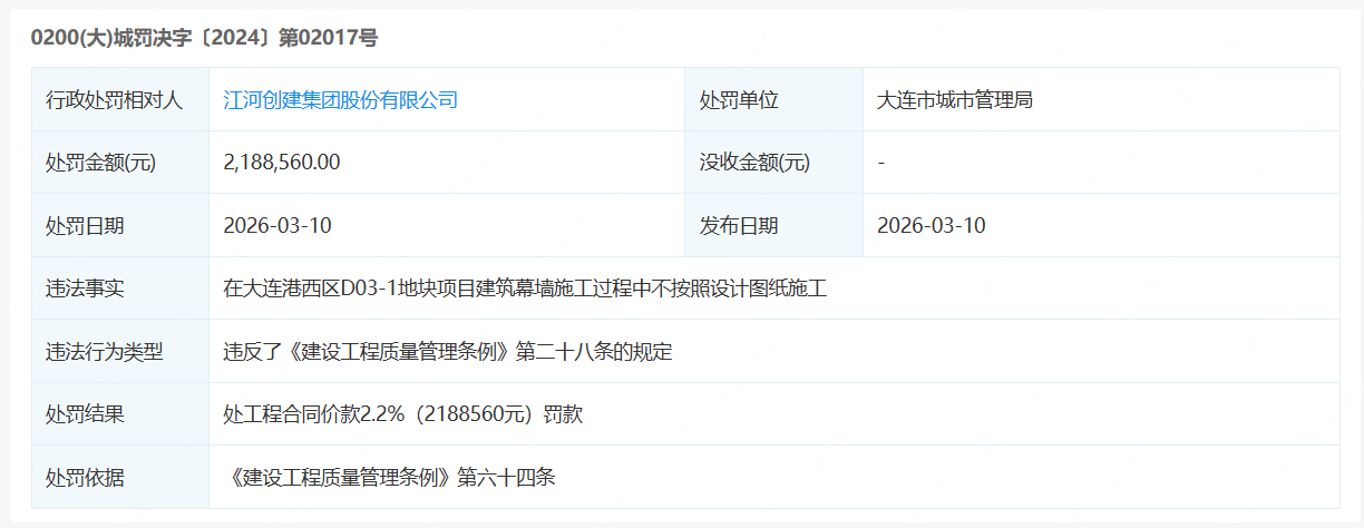 值得注意的是,3月10日,江河集团因在大连港西区D03-1地块项目建筑幕墙施工过程中不按照设计图纸施工,被大连市城市管理局罚款218.856万元。