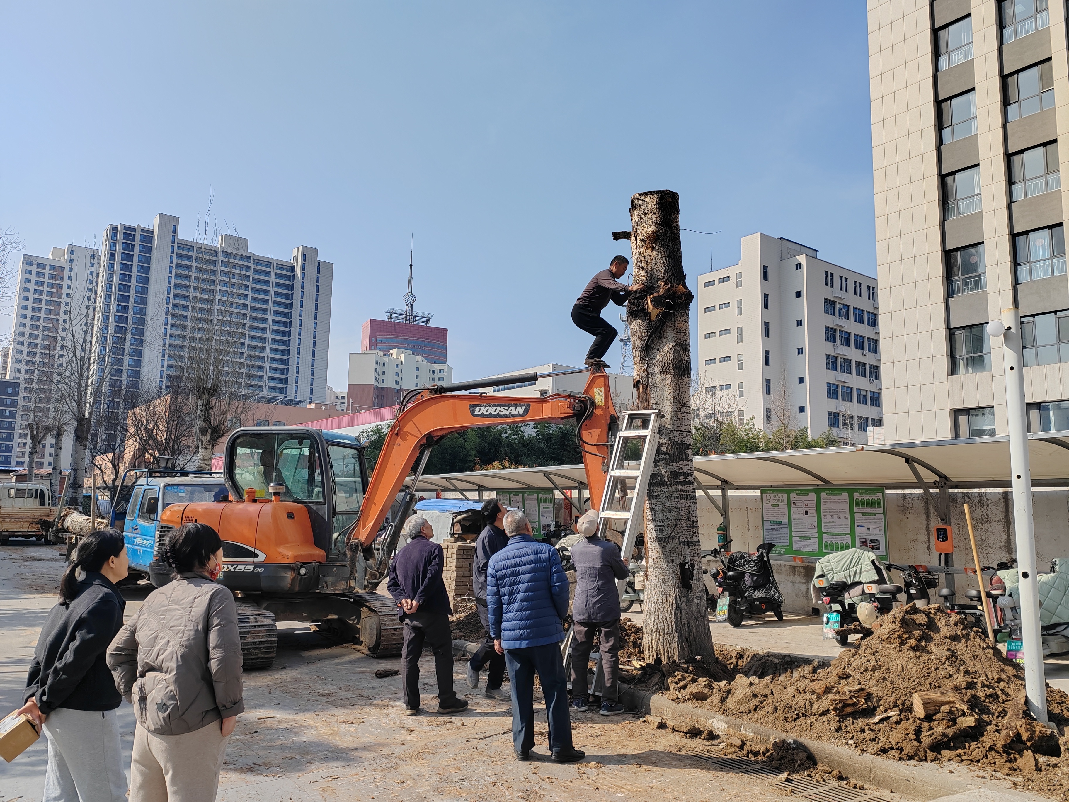 “这树枯了两年多,每次路过都提心吊胆的。”3月16日,淄博高新区四宝山街道万杰路社区新时代公寓小区北门车棚旁,居民王女士望着正在作业的挖掘机感慨道。随着三棵直径超30公分的枯杨树被连根拔起,压在居民心头多年的安全隐患终于消除。