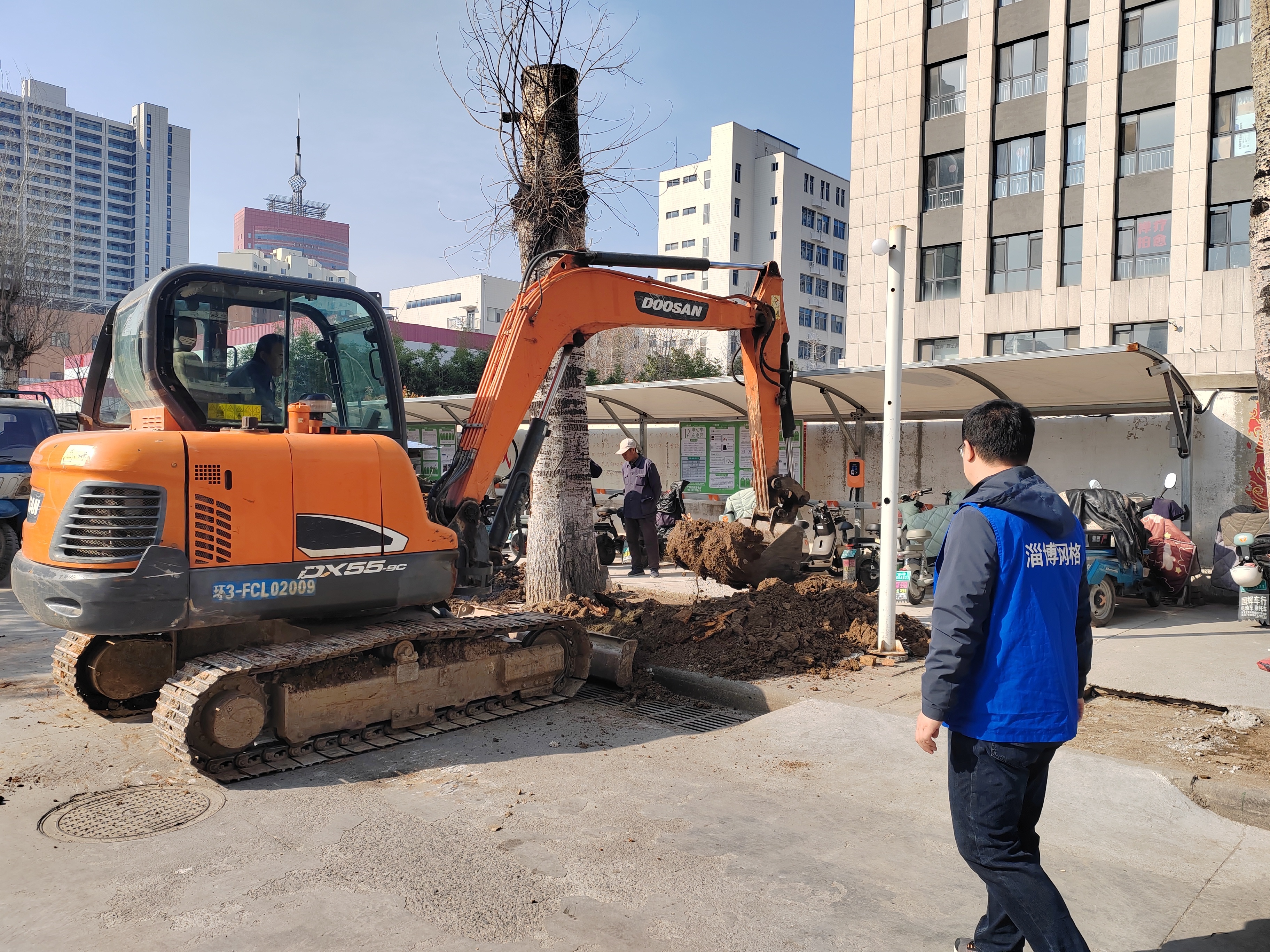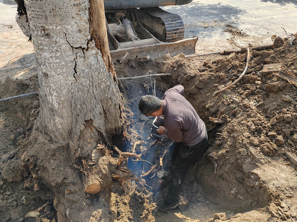 当日上午,接到居民反映,社区网格员丁宁前往现场查看,枯树所在位置恰是小区交通要道,立即启动应急预案,并联合淄博成远物业管理有限公司,确定采用挖掘机整体起拔的作业方式清理枯树。