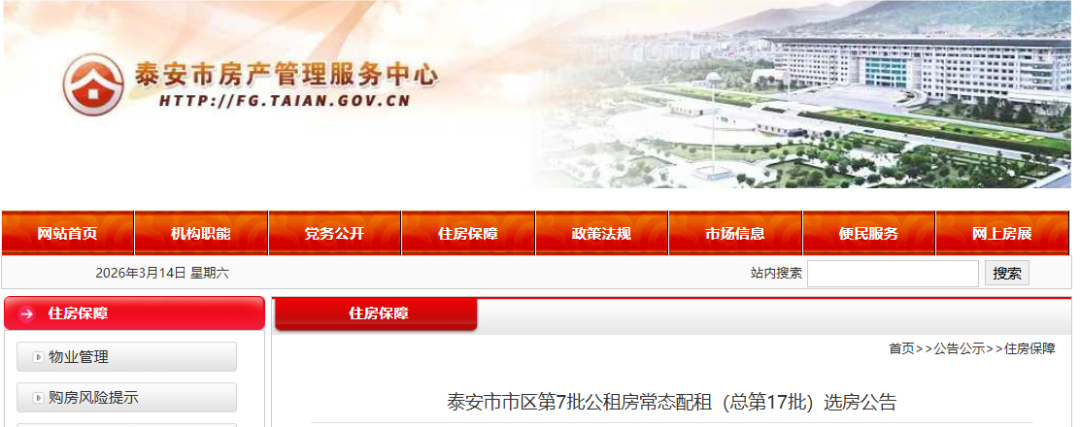 泰安市市区第7批公租房常态配租(总第17批)选房公告