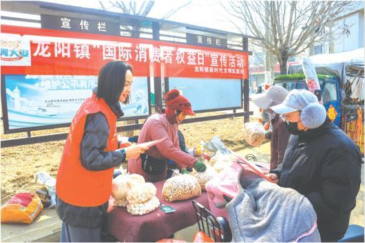 3月10日,滕州市龙阳镇组织志愿者走进龙阳农贸集市,开展普法宣传活动,将实用的消费维权知识送到百姓身边。活动现场,志愿者通过悬挂横幅、发放宣传资料等方式,向过往群众和集市摊主普及《中华人民共和国消费者权益保护法》,引得不少群众前来咨询。(王玉登 摄)