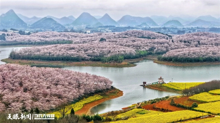 红枫湖畔的风,唤醒了贵安樱花园粉色的春天。2.4万亩樱林依山傍水绵延不绝,70万株樱花循着花期次第绽放,早樱似雪覆枝,晚樱粉黛含香,形成“樱云三叠”的绝美渐变。