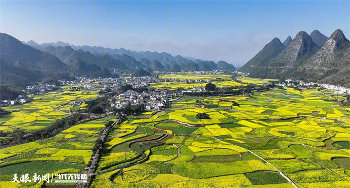 贵州最早的春信正是在这里悄然萌芽。6000余亩油菜花顺着峰谷褶皱铺展,青黛峰林如墨,金色花海似绸,布依村寨沿着蜿蜒的纳灰河点缀其间,炊烟袅袅间,尽是田园诗意。