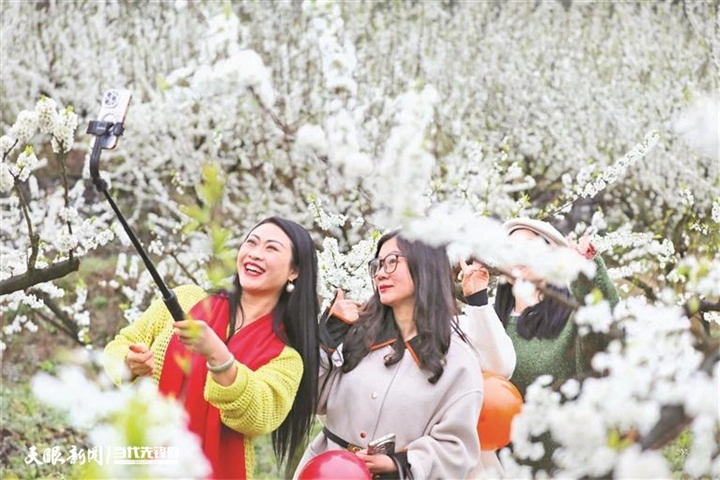 游客在毕节市黔西市太来乡方田村观赏千亩盛开的李子花。杨春 摄