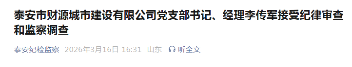 泰安市财源城市建设有限公司党支部书记、经理李传军涉嫌严重违纪违法,目前正接受泰安市泰山区纪委监委纪律审查和监察调查。