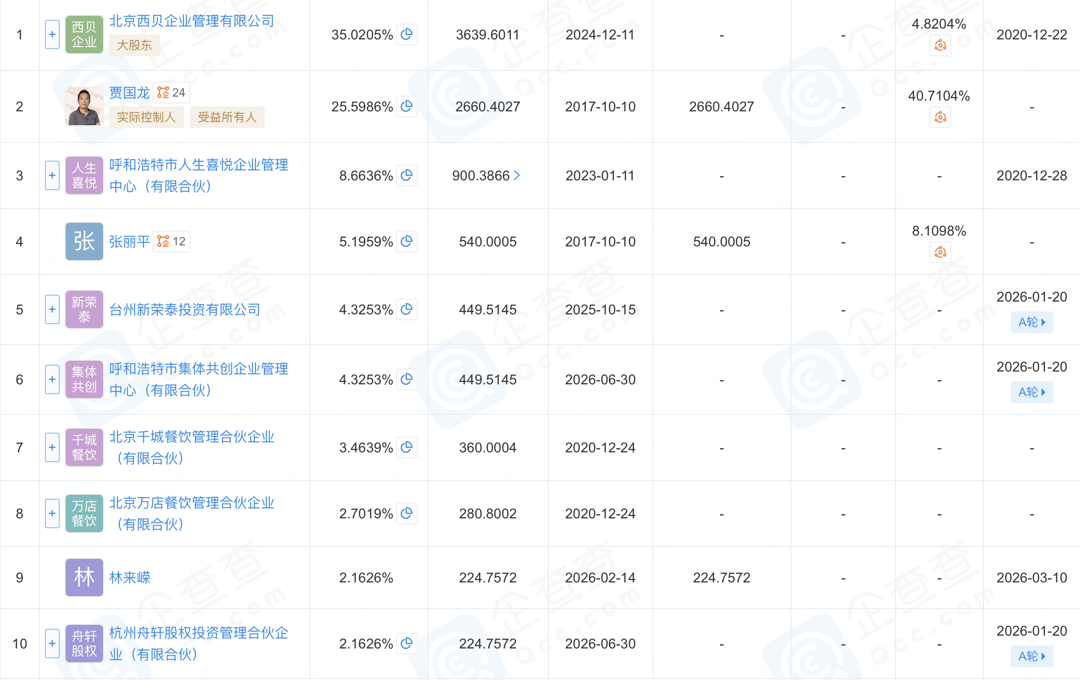 近日,据企查查工商信息显示,内蒙古西贝餐饮集团有限公司(以下简称“西贝”)于3月10日发生工商变更,新增林来嵘为股东,注册资本由约1.02亿元增至约1.04亿元。增资后,贾国龙持股比例由约26.16%进一步降至约25.60%。