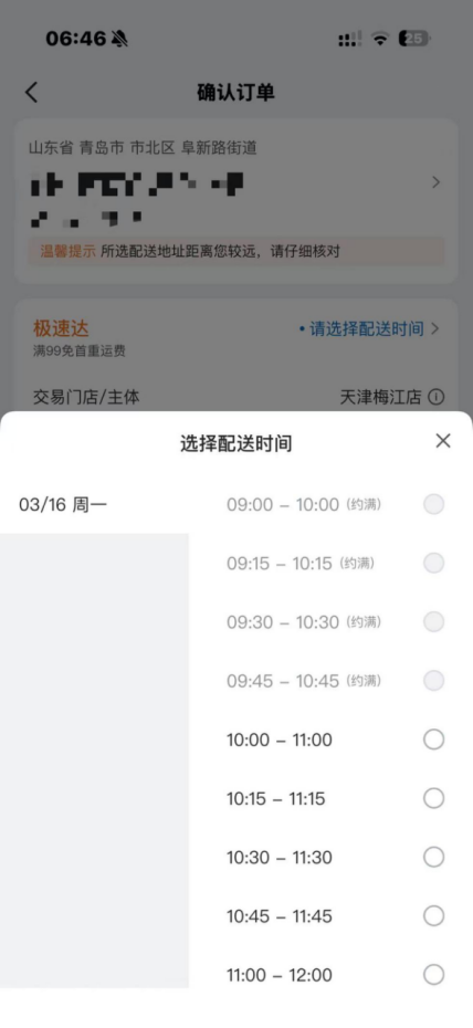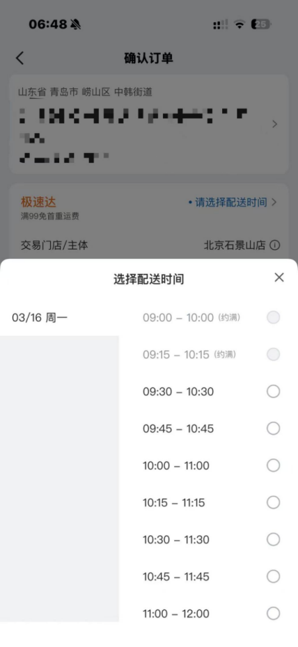 而值得注意的是,服务上线首日早高峰人气火爆,不同区域的本地仓配送时段均出现“约满”现象:早上不到7点,市北区地址对应本地仓9:00-10:45时段全部显示“约满”,最早可预约时段为10:00-11:00;崂山区地址对应本地仓9:00-10:15时段约满,最早可预约时段为9:30-10:30。