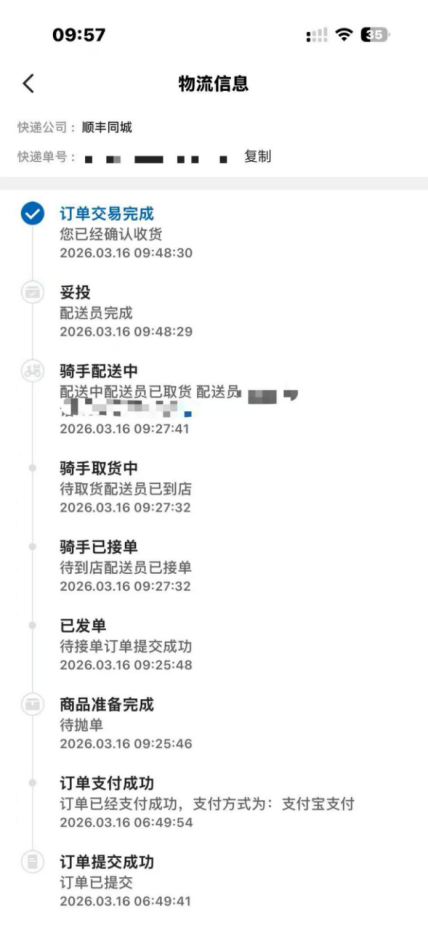 随后记者预约了10:00-11:00配送时段,9:25显示商品已发单,9:27骑手便接单取货,9:48显示货物妥投,记者已经收到商品,实际配送仅耗时21分钟,早于最早的配送时间12分钟。