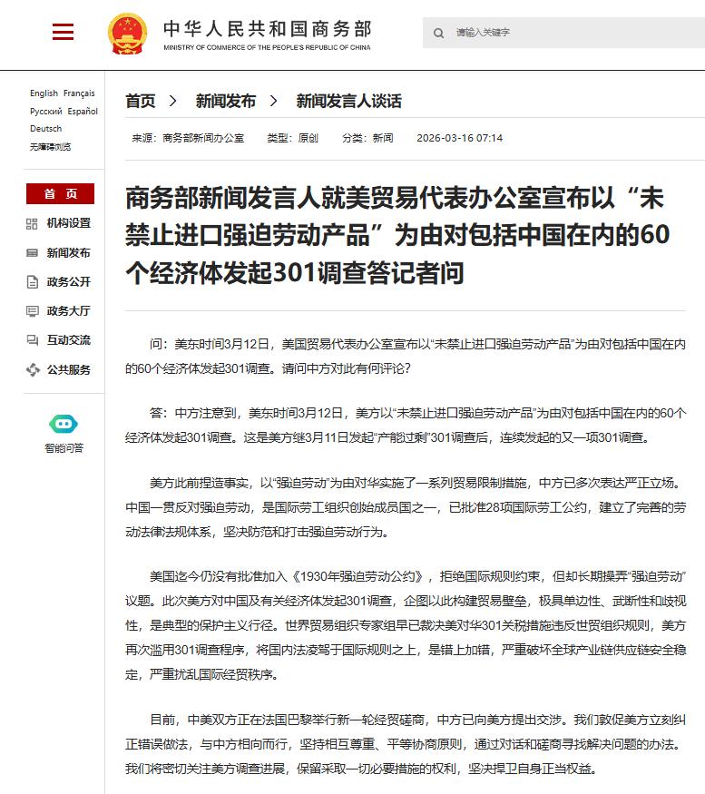 问:美东时间3月12日,美国贸易代表办公室宣布以“未禁止进口强迫劳动产品”为由对包括中国在内的60个经济体发起301调查。请问中方对此有何评论?